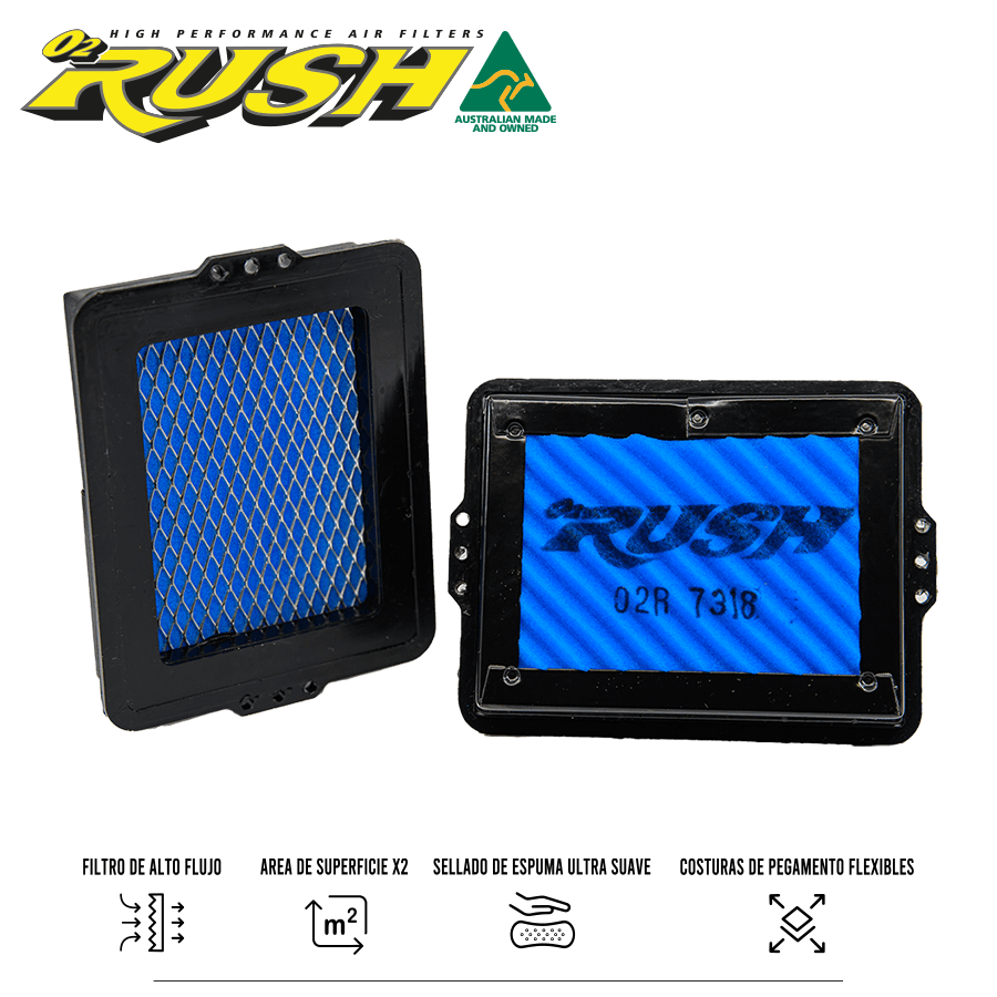 • Los filtros para motos de cross O2 Rush cuentan con sellos ultrablandos para proporcionar el sello definitivo entre la jaula del filtro de aire y la caja de aire.